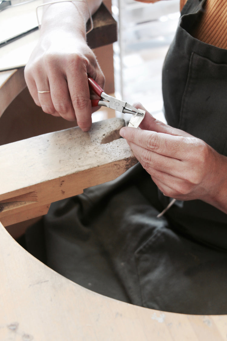 Le travail de Gabrielle Desmarais se caractérise par une rupture formelle et esthétique avec la tradition joaillière. Le format, grand du point de vue de l’échelle traditionnelle en joaillerie, la qualité des objets créés, résultant de son organisation, de sa structure, concrétisée par les lignes et les surfaces qui le délimitent, révèle le bijou à titre d’objet, de sculpture, destiné à être interprété en références à l’histoire de l’art, visuel et plastique.Évocateurs de contemplation et de recueillement, leur fabrication est constituée de techniques re-visitées et de procédés et déconstruits, par lesquelles l’artiste engage ainsi le Temps, le récupère et lui rend même hommage. Ces objets appréhendés par la vue et le toucher, permettent d’être distingués des autres objets, justement grace à l’intégration de matériaux alternatifs, quoique tout aussi précieux.